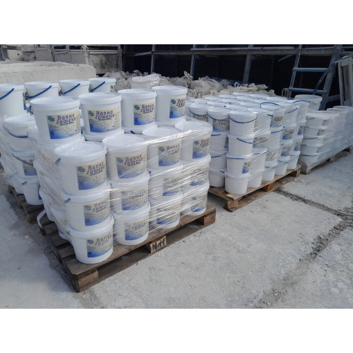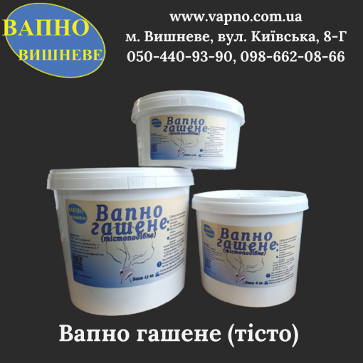 - вапно гашене (тісто) в мішках по 5 кг, 20 кг, 50 кг та в відрах по 4 кг, 6 кг та 13 кг;