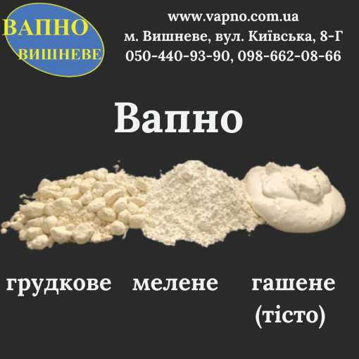 - вапно гашене (тісто) в мішках по 5 кг, 20 кг, 50 кг та в відрах по 4 кг, 7 кг та 14 кг;