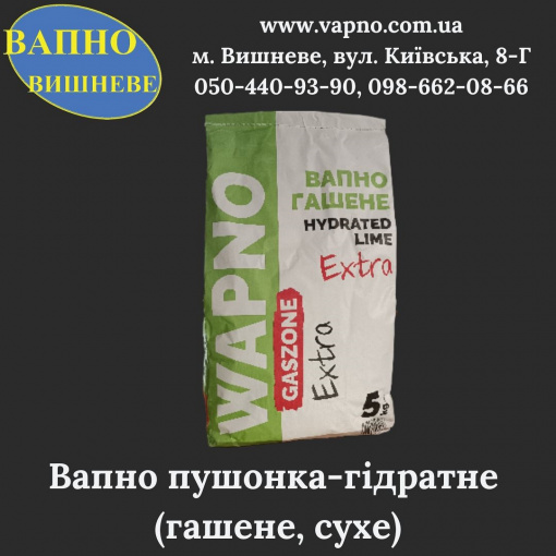 - вапно гідратне (пушонка, гашене сухе) в мішках по 25 кг та 5 кг;